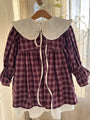 Designed in a dark purple base with light lavender checks and a soft white fabric finish, it embodies charm and sophistication in every thread. The dress also comes with an optional detachable collar — a thoughtful touch for those who love to style with versatility. Crafted with care and comfort in mind, it’s a timeless piece that beautifully blends grace with everyday wear.